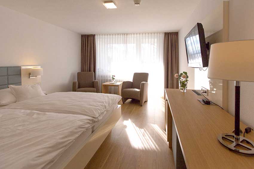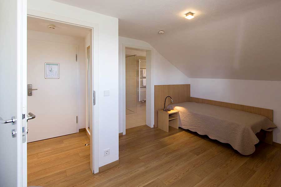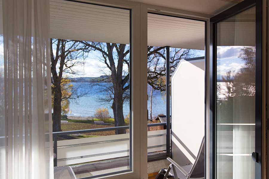 Sehr großzügiges Vier-Bett-Zimmer (ca. 45qm, 2 Schlafräume) mit Südbalkon und Seeblick, bis max. 4 Personen.